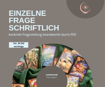 Du erhältst eine schriftliche, einfühlsame und klar formulierte Antwort auf deine konkrete Frage, liebevoll als PDF zusammengestellt, individuell, intuitiv und ehrlich gedeutet.